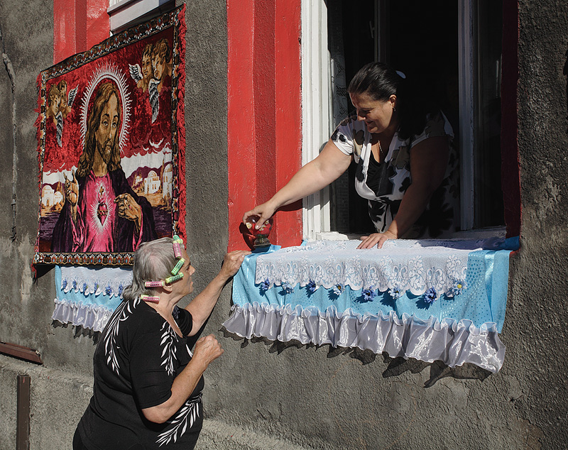 Procesja Bożego Ciała w Lipinach. Przygotowanie Ołtarza w oknie. 2009r.
