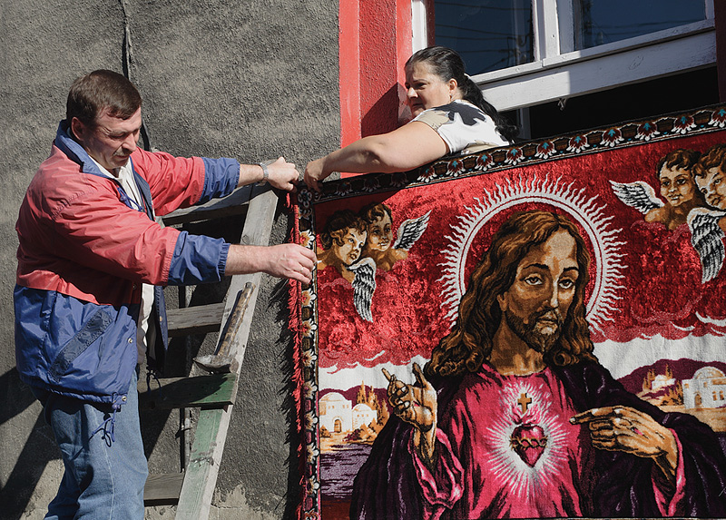 Procesja Bożego Ciała w Lipinach. Przygotowanie Ołtarza w oknie. 2009r.