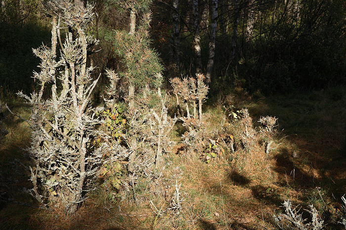 Uschłe po zgryzieniu przez łosie drzewka na wydmach śródleśnych pokryły porosty tworząc fantazyjne formy, silnie kontrastujące z kolorytem otoczenia.