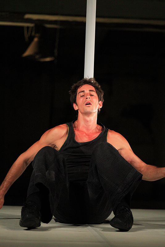 Przedstawieniew w hali starego dworca w Katowiach. Porządek zdjęć w cyklu ułożyłem zgodnie z moim odczytaniem spektaklu jako historii wzlotu i upadku. 23.08.2008.