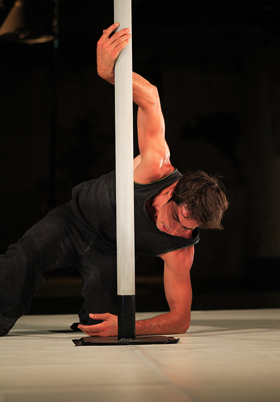 Przedstawieniew w hali starego dworca w Katowiach. Porządek zdjęć w cyklu ułożyłem zgodnie z moim odczytaniem spektaklu jako historii wzlotu i upadku. 23.08.2008.