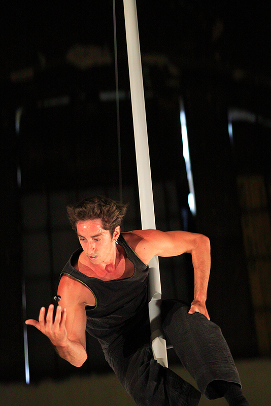 Przedstawieniew w hali starego dworca w Katowiach. Porządek zdjęć w cyklu ułożyłem zgodnie z moim odczytaniem spektaklu jako historii wzlotu i upadku. 23.08.2008.