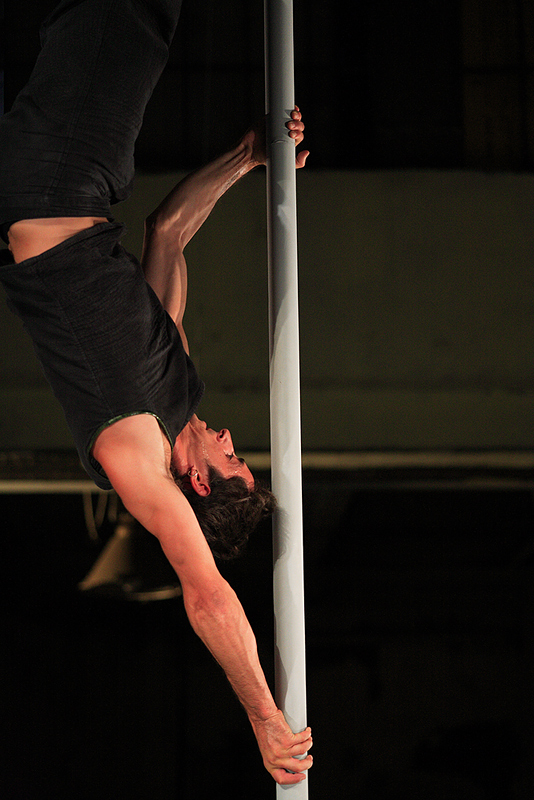Przedstawieniew w hali starego dworca w Katowiach. Porządek zdjęć w cyklu ułożyłem zgodnie z moim odczytaniem spektaklu jako historii wzlotu i upadku. 23.08.2008.