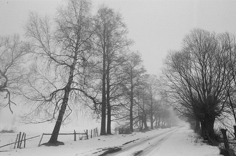 - Bagna biebrzańskie, drogi, Kapice, Kodak T-MAX 400 / 135, płoty, wierzby, zima,