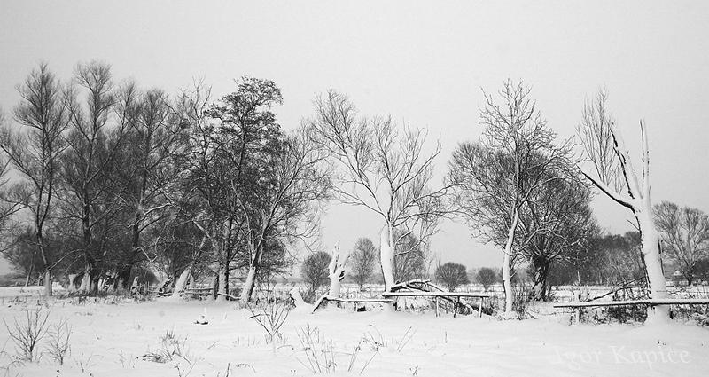 Do Kapic zawitała zima. Huraganowy wiatr wywiał późną jesień. Teraz do monotonnej szarości ostatnich dni dołączyła biel. Mokry i wilgotny śnieg osiadł na przydrożnych łąkach, wierzbach, płotach i polnych drogach. Niebo pozostało szare, ale biel wprowadziła w prawie monochromatyczny pejzaż zatraconą pod zasnutym chmurami niebem przejrzystość. Uwidoczniły się zagubione pośród szarości czernie. Pejzaż zgrafizował się, a zużyte już barwy lata i jesieni zakryła biel zimy.