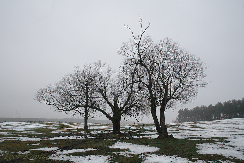 Pierwsza zimowa biel nie zadomowiła na długo. Śnieg zaczął się wytapiać, odsłaniając rudawo - zielone plamy. Ta surowa i zmienna mozaika sama w sobie zawiera nostalgiczną nutę zapatrzenia w dal. Ciężkie i wilgotne powietrze dzisiejszego dnia uczyniło to odczucie jeszcze bardziej dojmującym. Mgła raz po raz gęstniała do konsystencji dżdżu lub drobnych płatków śniegu. Kropelki wody osadzały się na źdźbłach traw i turzyc. Powyginane konary i gałęzie drzew wprowadzały w tę szarawą i wilgotną pustać zastygłą ekspresję ruchu.