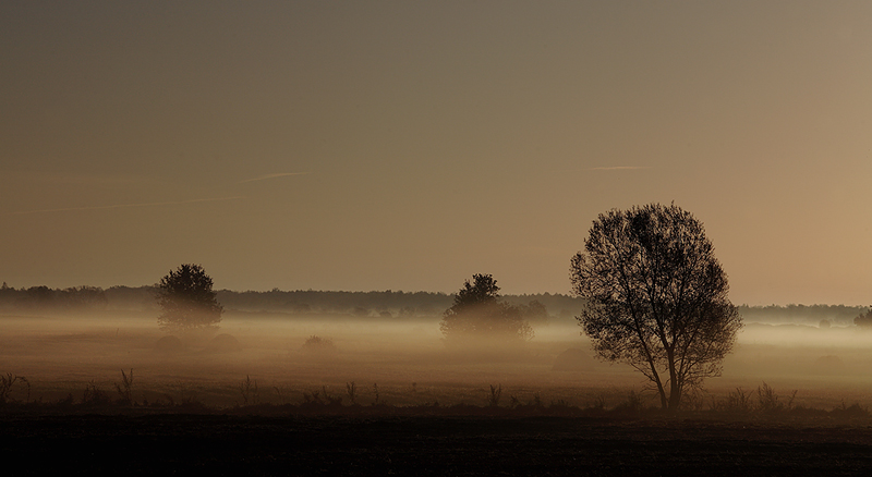Jest o poranku taka chwila, kiedy mgła układa się płasko i nisko nad ziemią. Mgła rozświetlona słonecznym blaskiem tworzy wyraźną białą linię, a drgające i wilgotne powietrze przed nią z daleka sprawia wrażenie tafli wody. Sceną dla takiego widowiska może być tylko szeroko otwarta przestrzeń i do tego otulająca wszystko cisza. Czasem dźwięczy w niej żurawi klangor, ale to zaiste królewskie dopełnienie całości.