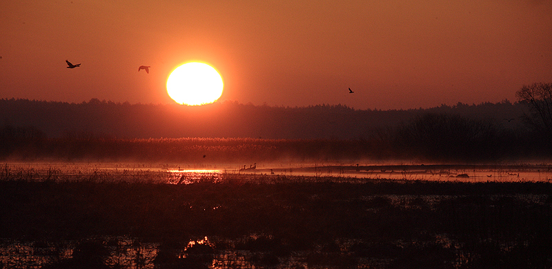 06.04.2012 Brzask na rozlewiskach Biebrzy kojarzy mi się z pastelowymi kolorami nieba odbijającymi się w wodzie i przestrzenią wypełnioną barwami po horyzont. Im bliżej wschodu tym barwy stają się intensywniejsze i bardziej nasycone przez wschodzące słońce. To tak jakby pastelowy pejzaż przeobrażał się w obraz olejny. Przemierzające przestrzeń ptaki dopełniają obraz. Potem pojawiają się delikatne odcienie złota i mieszają się z blednącą już czerwienią, misterium natury zatacza koło i powraca do przestrzeni malowanej pastelami, aby na końcu przejść w oczywistość dnia.