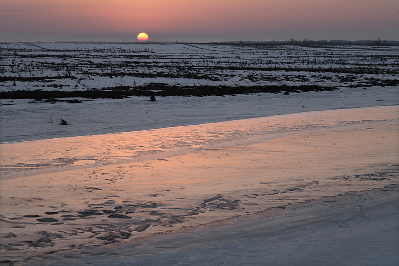 Zima to nie tylko pastele, bywa malowana kolorem mocnym i wyrazistym. Wschodzące w bezmgielny poranek nad linię horyzontu słońce, sprawia, że materia i faktura koloru nasyca się szczególnie intensywnie, nadając pejzażowi wrażenie ciężkości i gęstości olejnego obrazu.