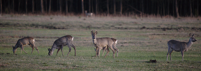 Długo utrzymująca się pokrywa śnieżna i opóźniona w tym roku wegetacja utrudniała sarnom zdobycie pożywienia.Teraz to intensywnie nadrabiają, a ich obecność i aktywność na otwartych przestrzeniach wokół Kapic jest właśnie teraz łatwo zauważalna. To dobry czas dla dla fotografowania, bowiem wiosna, zwłaszcza ta wczesna (a teraz taką mamy) , to czas, kiedy rozbujała i gęsta zieleń, nie dominuje jeszcze w pejżażu na tyle, aby swoją zwartą masą przytłaczać to co pozostałe. Sylwetki zwierząt nie zlewają się jeszcze ze zwartym zielonym tłem. W takim otoczeniu sarnie safari to prawdziwa przyjemność. Bezlistne jeszcze konary i gałęzie samotnie stojących brzóz dobrze odcinają się od przestrzeni nieba, nawet tego wieczornego. Do tego, już na sam koniec, księżyc w pełni, odbijający się w niewielkim rozlewisku, obdarował mnie nadzwyczaj łaskawie, wprowadzając w horyzontalną płaszczyznę nowy wymiar, ku górze, ku przestrzeni nieba.