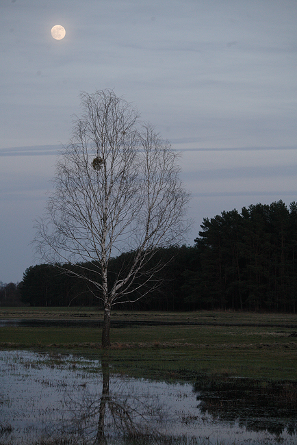 Długo utrzymująca się pokrywa śnieżna i opóźniona w tym roku wegetacja utrudniała sarnom zdobycie pożywienia.Teraz to intensywnie nadrabiają, a ich obecność i aktywność na otwartych przestrzeniach wokół Kapic jest właśnie teraz łatwo zauważalna. To dobry czas dla dla fotografowania, bowiem wiosna, zwłaszcza ta wczesna (a teraz taką mamy) , to czas, kiedy rozbujała i gęsta zieleń, nie dominuje jeszcze w pejżażu na tyle, aby swoją zwartą masą przytłaczać to co pozostałe. Sylwetki zwierząt nie zlewają się jeszcze ze zwartym zielonym tłem. W takim otoczeniu sarnie safari to prawdziwa przyjemność. Bezlistne jeszcze konary i gałęzie samotnie stojących brzóz dobrze odcinają się od przestrzeni nieba, nawet tego wieczornego. Do tego, już na sam koniec, księżyc w pełni, odbijający się w niewielkim rozlewisku, obdarował mnie nadzwyczaj łaskawie, wprowadzając w horyzontalną płaszczyznę nowy wymiar, ku górze, ku przestrzeni nieba.