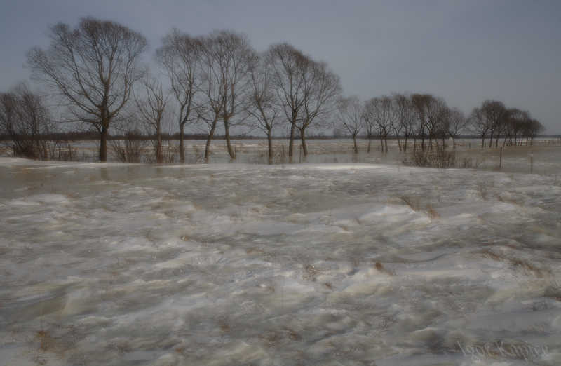 Na wyżej położonych i nie tak mocno zalanych łąkach, na kępiastym turzycowym podłożu, pozostały przewiane płaty śniegu, które układają się w formy przypominające wysmagane wiatrem wydmy. Tu i ówdzie przebijają się przez te nierówne biało - rdzawe podłoże kępy turzyc, na tyle wysokie, że lód i śnieg nie zakryły ich. A wiatr poleciał dalej, pozostawiając po sobie wysmagane zimnym pędem lodowe formy i faktury. Na razie pilnuje ich mróz, ale kiedy i on odejdzie to surowe piękno zamieni się w wodę i odpłynie poza linię horyzontu.