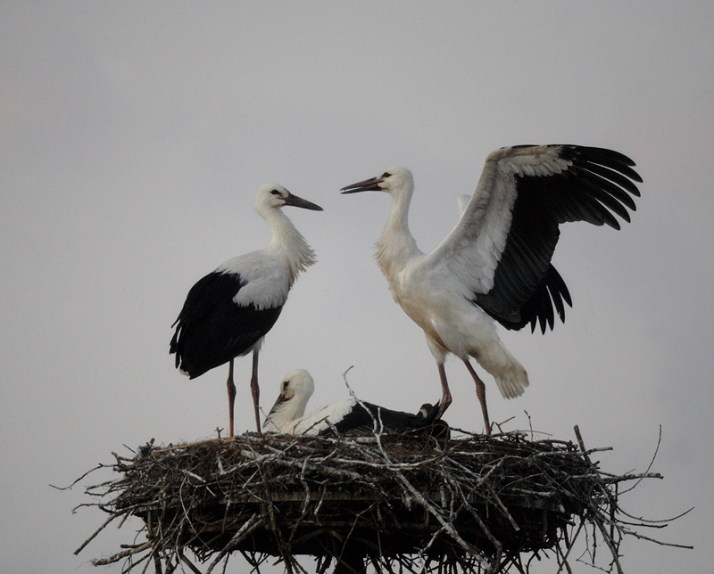 Młode bociany szybko rosną. W lipcu są już na tyle duże, że w gnieździe robi się ciasno. Bocianiuki są coraz aktywniejsze, rozkładają i prostują skrzydła, podskakują, wypinają piersi, rozpierają się i staczają drobne potyczki pomiędzy sobą, a na to w gnieździe potrzebna jest przestrzeń. Z tego powodu rodzice nocują i odpoczywają już dachach pobliskich zabudowań. Do gniazda przylatują po to, aby dostarczyć bocianiukom pokarm. Młode ptaki przygotowują się do pierwszego lotu. Po nim pod czujnym okiem i opieką dorosłych udadzą się na kapickie łąki. W sierpniu będą już samodzielne i gotowe do odlotu. Na razie wpisują się swoją obecnością w mój przydomowy pejzaż.