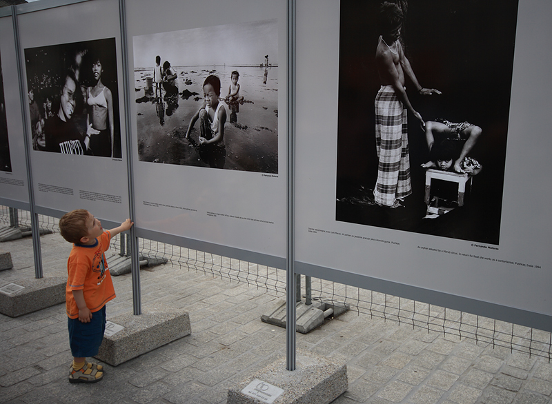 canon 400 D, sigma 10 -20, Kraków rynek, dziecko na tle wystawy fotograficznej o pracujących dzieciach