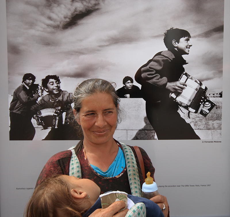 canon 400 D, sigma 10 -20, Kraków rynek, cyganka z dzieckiem na tle wystawy fotograficznej o pracujących dzieciach