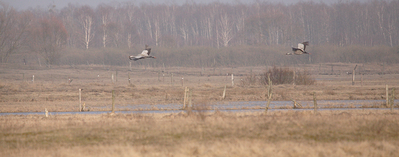 Nie wszystko jedno gdzie fotografuje się żurawie , sarny, łosie lub gęsi. Napiękniej prezentują się pośród zalanych łąk, drewnianych kołków wyznaczajacych rytmy w otwartej przestrzeni, samotnych wierzb, na tle oddalonych brzezin. Sylwetki zwierząt dopełniają tę przestrzeń. To dlatego często lepiej jest tutaj, nad Biebrzą, fotografować zwierzęta wtopione naturalnie w pejzaż, nawet z oddali, niż wycinać ich sylwetki z otoczenia z którym tworzą nierozerwalną całość.