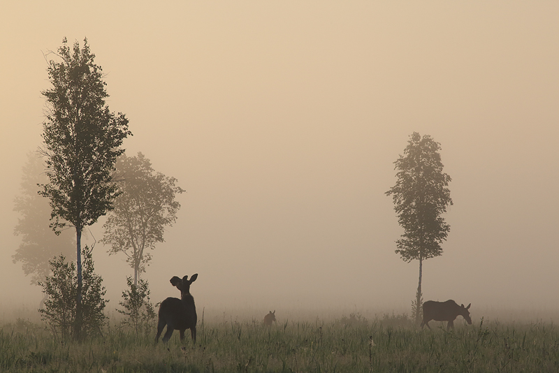 - Bagna biebrzańskie, łosie, mglisto,