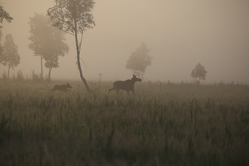 - Bagna biebrzańskie, łosie, mglisto,