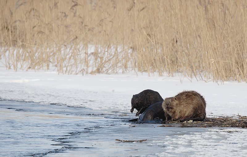 Luty 2011 . Tym bobrom zalało żeremię, więc przytulone do siebie pozostają na zewnątrz.