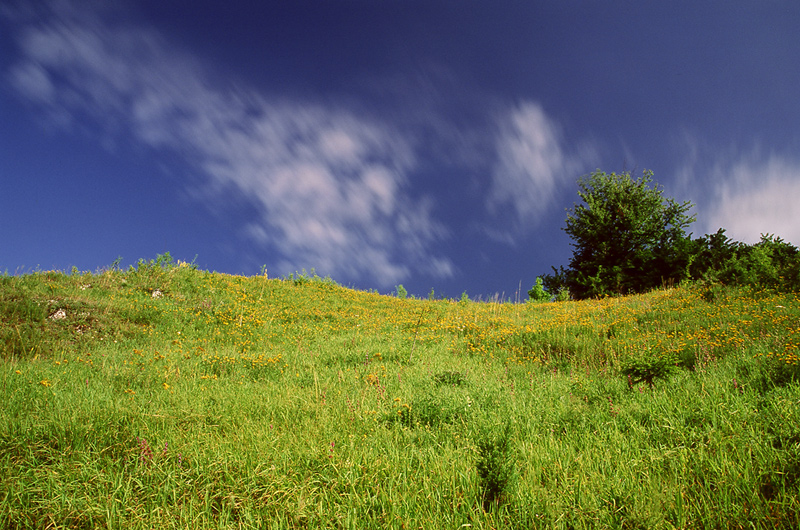 scan z przeźrocza, filtry połówkowy i szary, ze statywu po to by chmury były ruszone. Jurajskie pola. Jura. Pola.