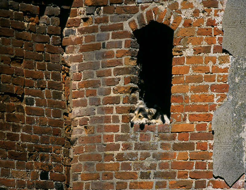 Canon 30, welvia 50, Canon 30, welvia 50, sigma 135-400, W oknie baszty na zamku w Szymbarku czuwa pies, który szczekaniem przywołuje stróża. Z okna obserwuje most przez fosę.