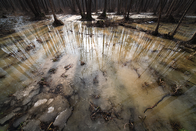 Nazwa Czerwone Bagno odpowiada kolorystyce tegorocznego marca na bagnach. Warstwa lodu oddziela wodę ze stopionego śniegu od torfu, gałązek, liści, dzięki czemu woda jest przeźroczysta i światło znakomicie oddaje kolory podłoża. Ols.
