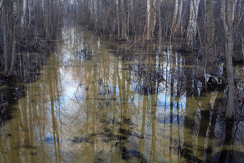Nazwa Czerwone Bagno odpowiada kolorystyce tegorocznego marca na bagnach. Warstwa lodu oddziela wodę ze stopionego śniegu od torfu, gałązek, liści, dzięki czemu woda jest przeźroczysta i światło znakomicie oddaje kolory podłoża. Droga przez ols i brzezinę znad Otoku ku Czerwonemu Bagnu