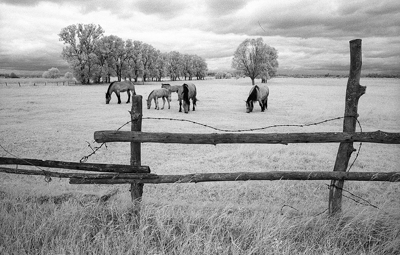 - Bagna biebrzańskie, Hoya filtr Infrared R72, konie, płoty, podczerwień, ROLLEI Infrared 400/36 - film na podczer,