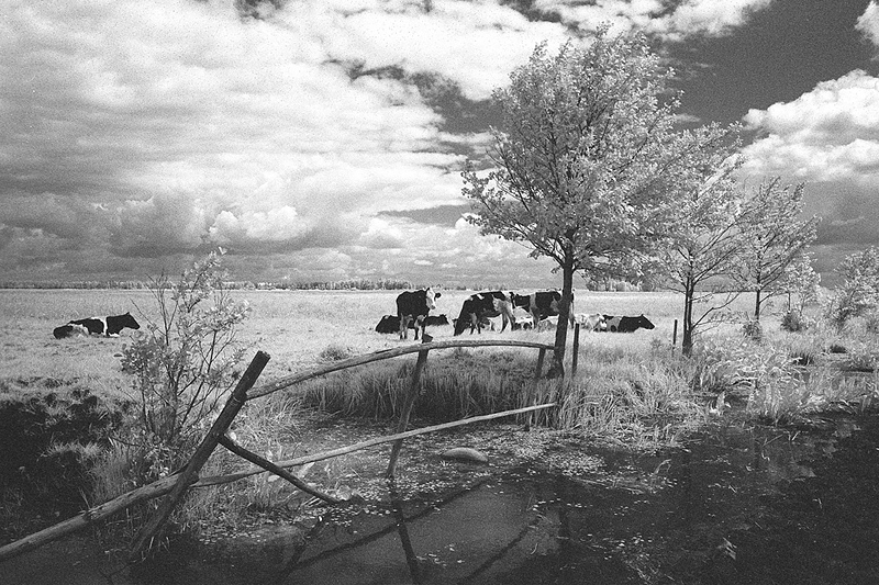 - Biały grąd, Hoya filtr Infrared R72, krowy, płoty, podczerwień, ROLLEI Infrared 400/36 - film na podczer,