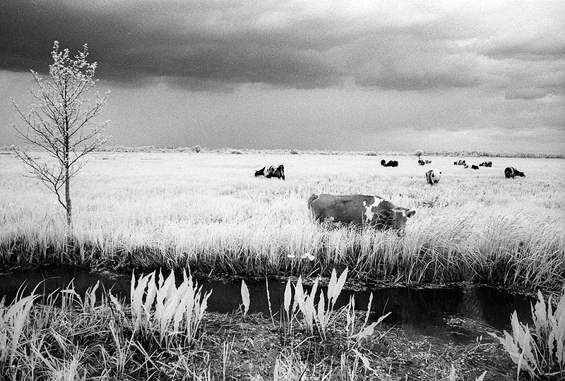 - Bagna biebrzańskie, Biały grąd, Hoya filtr Infrared R72, krowy, podczerwień, ROLLEI Infrared 400/36 - film na podczer,