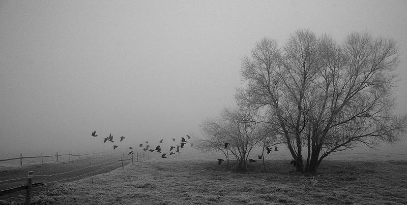 Mgła, taka co otula milczeniem, tak że nie słychać nawet trzepotu skrzydeł odlatujących ptaków , odziera przesztrzeń z chałasu i zgiełku. W tej ascetycznej ciszy, jeśli się tylko zatrzymamy się w bezruchu można usłyszeć Boga.