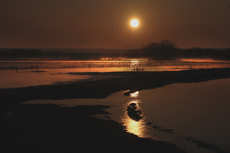 06.04.2012 Brzask na rozlewiskach Biebrzy kojarzy mi się z pastelowymi kolorami nieba odbijającymi się w wodzie i przestrzenią wypełnioną barwami po horyzont. Im bliżej wschodu tym barwy stają się intensywniejsze i bardziej nasycone przez wschodzące słońce. To tak jakby pastelowy pejzaż przeobrażał się w obraz olejny. Przemierzające przestrzeń ptaki dopełniają obraz. Potem pojawiają się delikatne odcienie złota i mieszają się z blednącą już czerwienią, misterium natury zatacza koło i powraca do przestrzeni malowanej pastelami, aby na końcu przejść w oczywistość dnia.