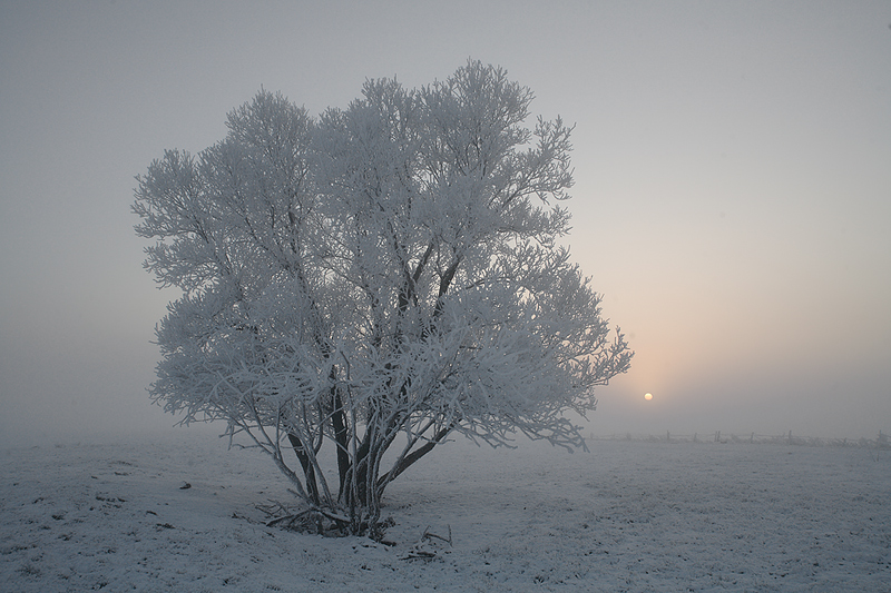 Tym razem coś pogodniejszego niż uprzednio. Mgła wyłagadza blask wschodzącego słońca na tyle, że można patrzeć prosto w nie. Jaskrawość słoneczna przemienia się w delikatne i rozproszone światło, które padając na śnieg współtworzy pastelowe odcienie poranka. Szron na drzewach i płotach podkreśla szarawa tonacja nieba, które zlewa się z linią horyzontu niezauważalnie, bez wyraźnej granicy. Szare odcienie mgły mieszają się z bielą, żółcią wschodzącego słońca i opatulającą to wszystko ciszą. Materia przestrzeni takiego poranka wydaje się być zagęstniała, wręcz wyczuwalna dotykiem.