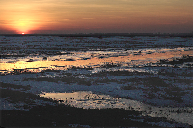 Zima to nie tylko pastele, bywa malowana kolorem mocnym i wyrazistym. Wschodzące w bezmgielny poranek nad linię horyzontu słońce, sprawia, że materia i faktura koloru nasyca się szczególnie intensywnie, nadając pejzażowi wrażenie ciężkości i gęstości olejnego obrazu.