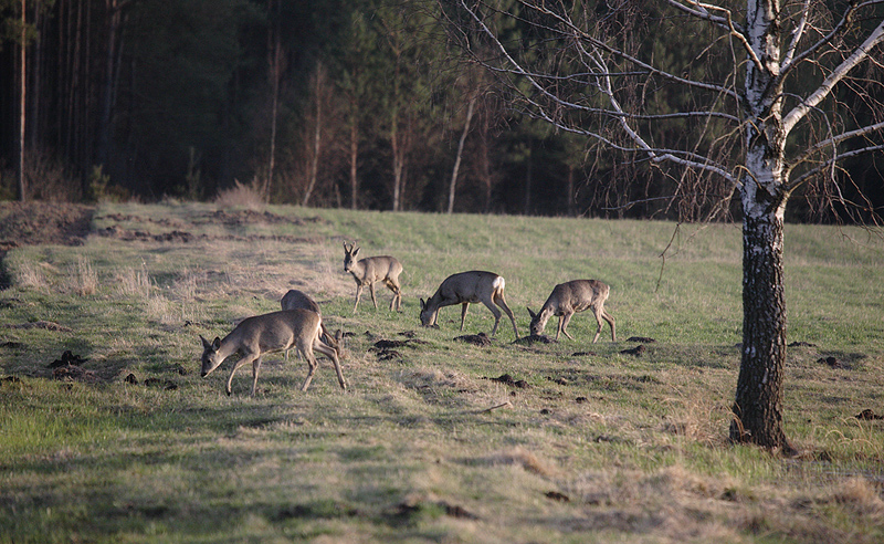 Długo utrzymująca się pokrywa śnieżna i opóźniona w tym roku wegetacja utrudniała sarnom zdobycie pożywienia.Teraz to intensywnie nadrabiają, a ich obecność i aktywność na otwartych przestrzeniach wokół Kapic jest właśnie teraz łatwo zauważalna. To dobry czas dla dla fotografowania, bowiem wiosna, zwłaszcza ta wczesna (a teraz taką mamy) , to czas, kiedy rozbujała i gęsta zieleń, nie dominuje jeszcze w pejżażu na tyle, aby swoją zwartą masą przytłaczać to co pozostałe. Sylwetki zwierząt nie zlewają się jeszcze ze zwartym zielonym tłem. W takim otoczeniu sarnie safari to prawdziwa przyjemność. Bezlistne jeszcze konary i gałęzie samotnie stojących brzóz dobrze odcinają się od przestrzeni nieba, nawet tego wieczornego. Do tego, już na sam koniec, księżyc w pełni, odbijający się w niewielkim rozlewisku, obdarował mnie nadzwyczaj łaskawie, wprowadzając w horyzontalną płaszczyznę nowy wymiar, ku górze, ku przestrzeni nieba.