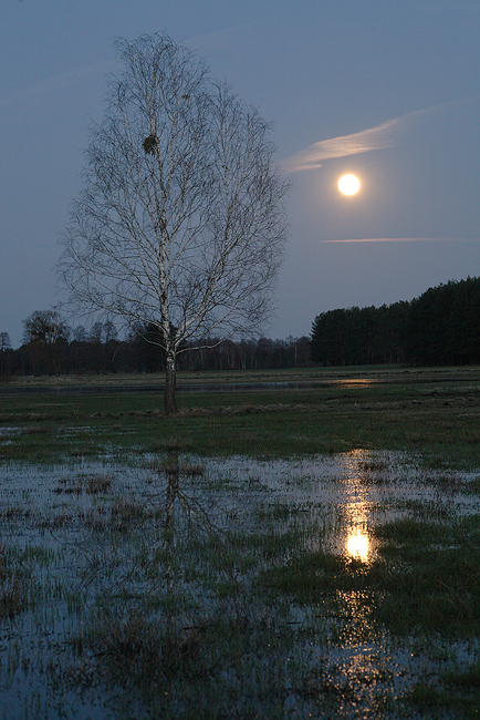 Długo utrzymująca się pokrywa śnieżna i opóźniona w tym roku wegetacja utrudniała sarnom zdobycie pożywienia.Teraz to intensywnie nadrabiają, a ich obecność i aktywność na otwartych przestrzeniach wokół Kapic jest właśnie teraz łatwo zauważalna. To dobry czas dla dla fotografowania, bowiem wiosna, zwłaszcza ta wczesna (a teraz taką mamy) , to czas, kiedy rozbujała i gęsta zieleń, nie dominuje jeszcze w pejżażu na tyle, aby swoją zwartą masą przytłaczać to co pozostałe. Sylwetki zwierząt nie zlewają się jeszcze ze zwartym zielonym tłem. W takim otoczeniu sarnie safari to prawdziwa przyjemność. Bezlistne jeszcze konary i gałęzie samotnie stojących brzóz dobrze odcinają się od przestrzeni nieba, nawet tego wieczornego. Do tego, już na sam koniec, księżyc w pełni, odbijający się w niewielkim rozlewisku, obdarował mnie nadzwyczaj łaskawie, wprowadzając w horyzontalną płaszczyznę nowy wymiar, ku górze, ku przestrzeni nieba.