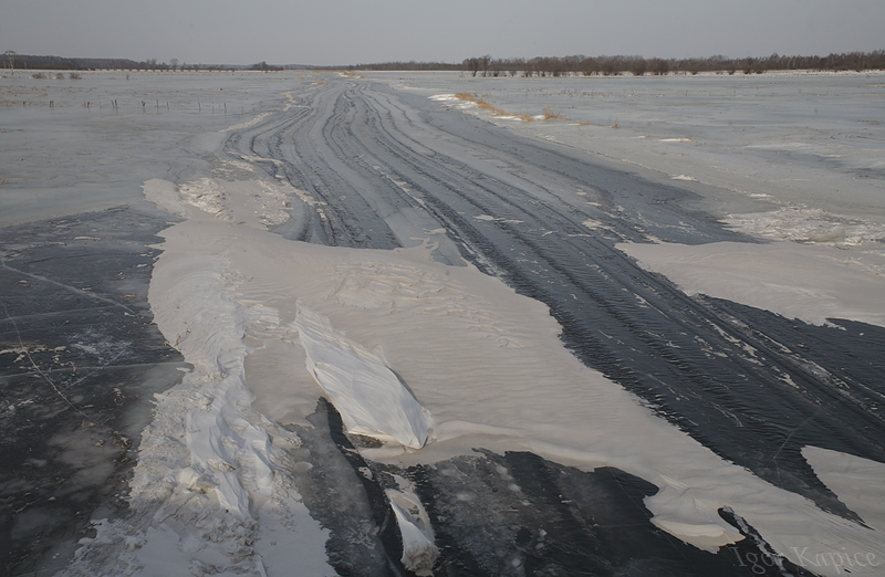 Wiatr rozpędzał się wzdłuż Kanału Rudzkiego i gnał przed siebie. Jego mroźny powiew zapisał swój impet w smugach prowadzących wzrok ku linii horyzontu. Woda w kanale ścięła się na tyle raptownie, że jej pomarszczenia utrwaliły się w fakturze lodu. A wiatr poleciał dalej, pozostawiając po sobie wysmagane zimnym pędem lodowe formy i faktury. Na razie pilnuje ich mróz, ale kiedy i on odejdzie to surowe piękno zamieni się w wodę i odpłynie poza linię horyzontu.