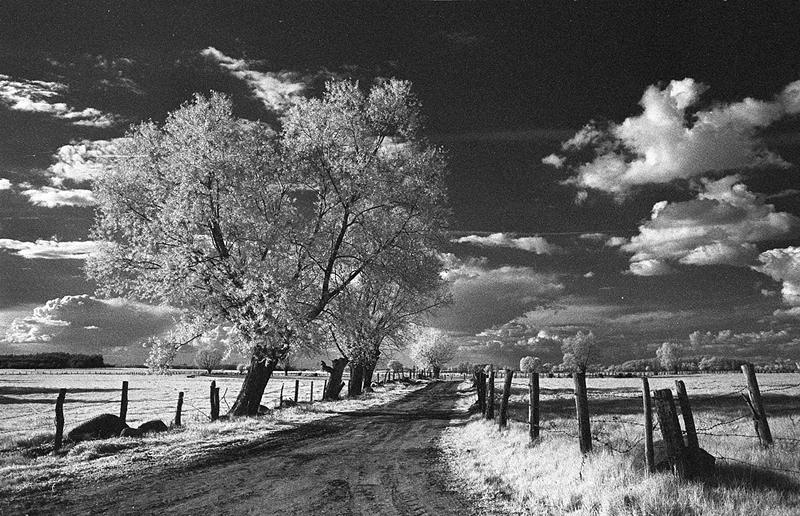 - Bagna biebrzańskie, drogi, Hoya filtr Infrared R72, Okrasin, płoty, podczerwień, ROLLEI Infrared 400/36 - film na podczer, wierzby,