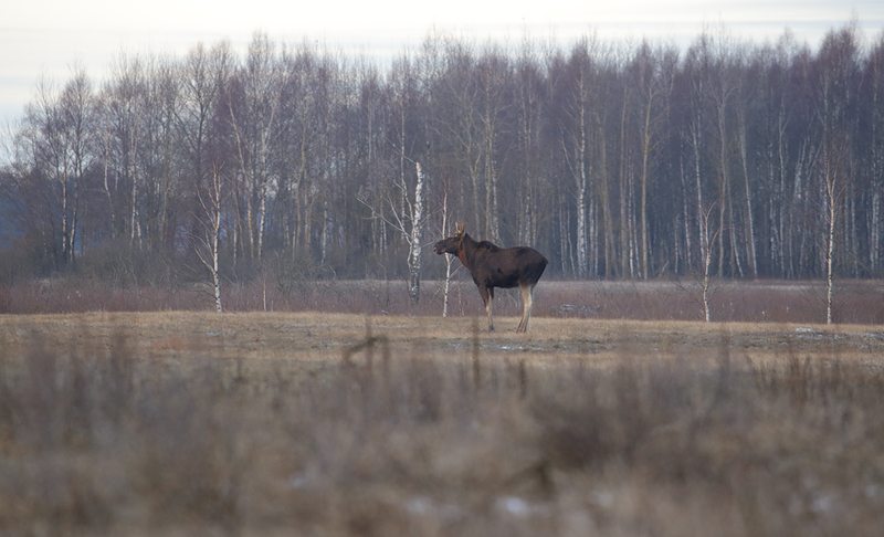 Łosie wędrują przez Kapice. To już zima choć, śniegu nie ma.