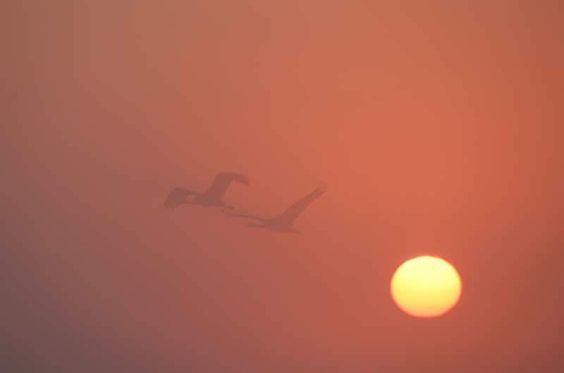 - Bagna biebrzańskie, blask, mglisto, wschód słońca, żurawie,